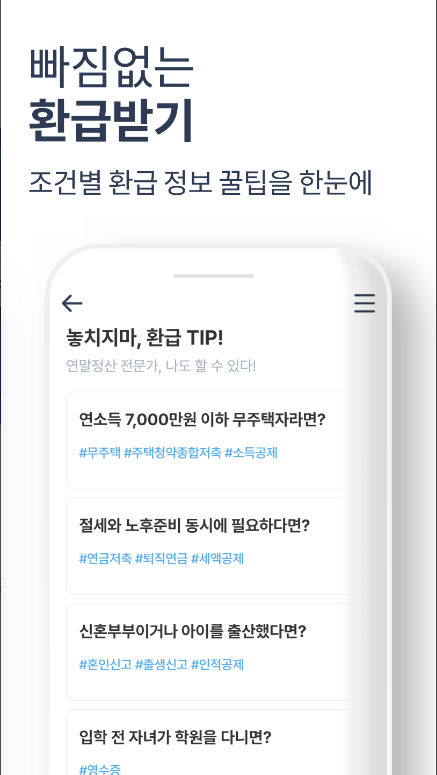 ▣ 곧 연말정산인데, 이제 와서 환급을 더 받을 수 있는 방법이 있을까? 이미 늦지 않았을까? 앱에 있는 환급 팁을 체크해 보세요! 바뀐 정책과 숨은 정보들을 비교하여 다가오는 연말정산 전까지 환급금을 대폭 늘려보세요!